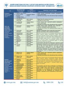 Харин “Чингис хаан” Олон улсын нисэх буудал, Алтанбулаг автозамын, Сүхбаатар, Эрээнцавын төмөр зам болон автозамын, Замын-Үүд дэх төмөр замын боомт энгийн цагийн хуваарийн дагуу ажиллана.